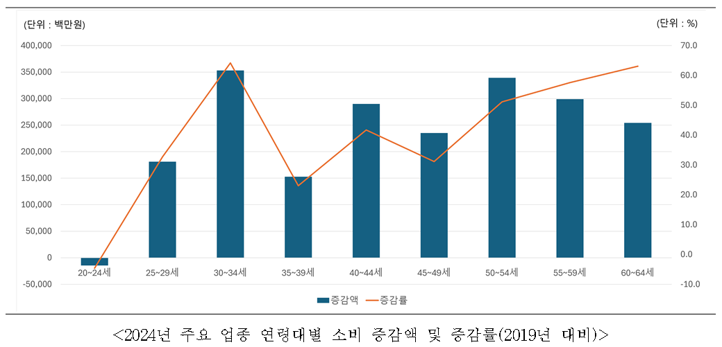 연구 결과, 2024년 기준 50대 이상의 소비 금액과 건수가 큰 폭으로 증가하며 적극적인 소비 주체로 부상했다. 50~54세의 소비 금액은 2019년 대비 51.0%, 55~59세는 57.5%, 60~64세는 63.1% 증가했다. 이는 30~34세의 64.2% 증가율을 제외하고 가장 높은 수치로, 중장년층이 경제의 새로운 축으로 떠오르고 있음을 보여준다.