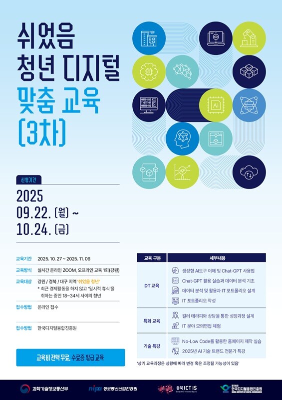 이 중 자립준비청년교육 1차는 대구 지역 교육장에서 오프라인 특화 교육이 진행되며, 쉬었음 청년 디지털 맞춤 교육 3차와 자립준비청년 디지털 맞춤교육 2차는 강원 지역 교육장에서 특화 교육이 진행될 예정이다.