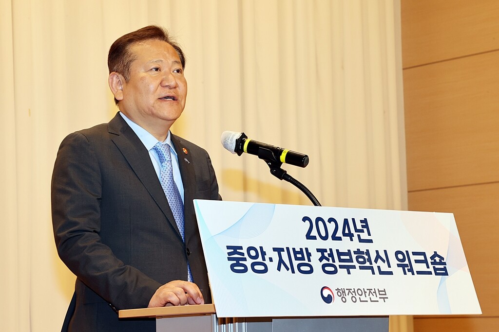 <이상민 행정안전부 장관이 7일 오후 충남 아산시 캠코 인재개발원에서 열린 2024년 중앙·지방 정부혁신 워크숍에 참석하여 인사말을 하고 있다.>