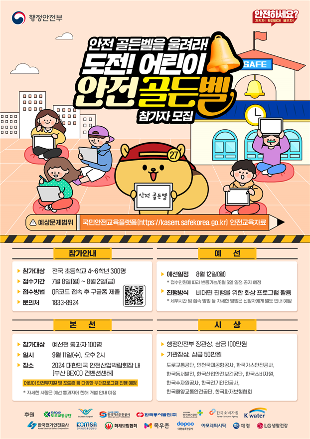 '안전골든벨'은 학생들이 일상생활 속에서 반드시 알아야 할 안전 수칙을 문제로 푸는 퀴즈대회로, 올해는 초등학교 고학년(4~6학년)을 대상으로 7월 8일부터 8월 2일까지 참가자 300명을 모집한다.
