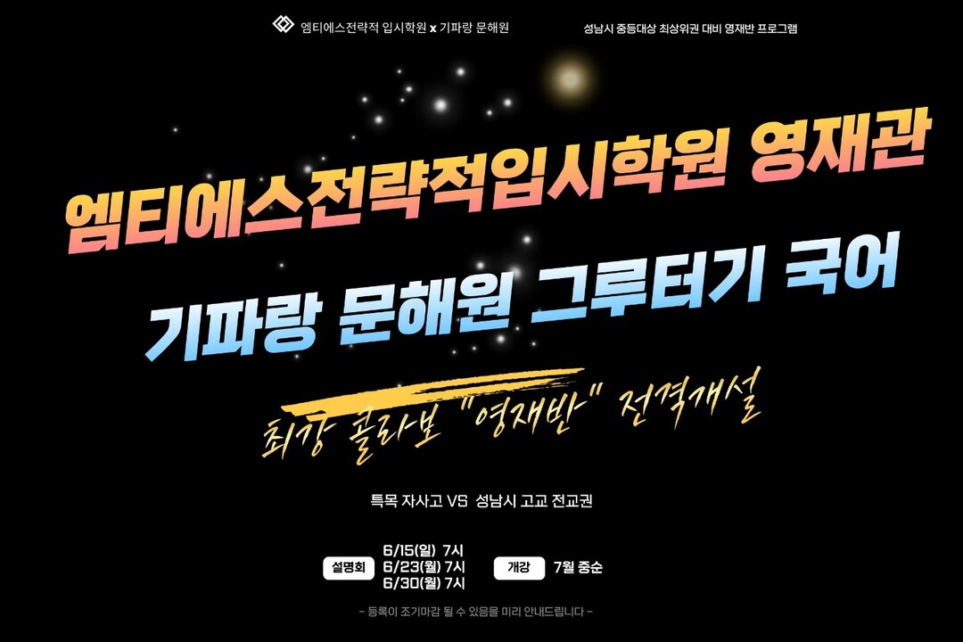 성남 지역 중등 입시 시장에 새로운 바람이 불고 있다. 성남 대표 입시기관인 ‘엠티에스 전략적입시학원 영재관’과 인문학 중심의 독서·논술 특화 학원 ‘기파랑문해원 그루터기국어학원’이 손잡고, 중2·중3 최상위권 학생을 위한 맞춤형 ‘영재 프로그램’을 공동 운영한다. 이번 협업은 각 기관이 보유한 전문성과 실적, 입시전략 시너지를 기반으로 성사됐다.