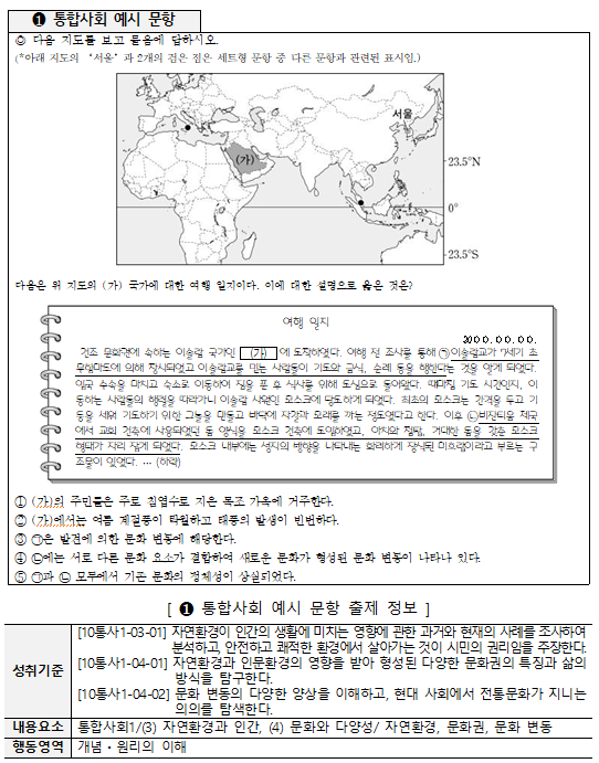 통합사회는 여러 학문 분야를 통합해 사회 현상에 대한 이해와 분석 역량을 키우는 데 중점을 둔다. 이번에 공개된 예시 문항에서는 학생들이 자연환경과 문화적 특성이 인간의 생활에 어떻게 영향을 미치는지, 다양한 문화권과 삶의 방식을 탐구할 수 있는지를 평가한다.