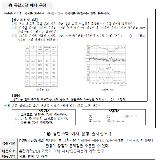 예시 문항에는 디지털 센서를 활용해 실시간 기상 데이터를 측정하고, 이를 분석해 과학적 결론을 도출하는 과정이 포함됐다. 학생들은 빅데이터를 활용해 과학적 문제를 해결하는 능력과 그 과정에서 나타나는 문제점을 분석할 수 있는 역량을 요구받게 된다. 이처럼 통합과학은 다양한 과학 분야의 지식을 통합하고 실제 상황에 적용할 수 있는 능력을 평가하는 데 중점을 두고 있다 .