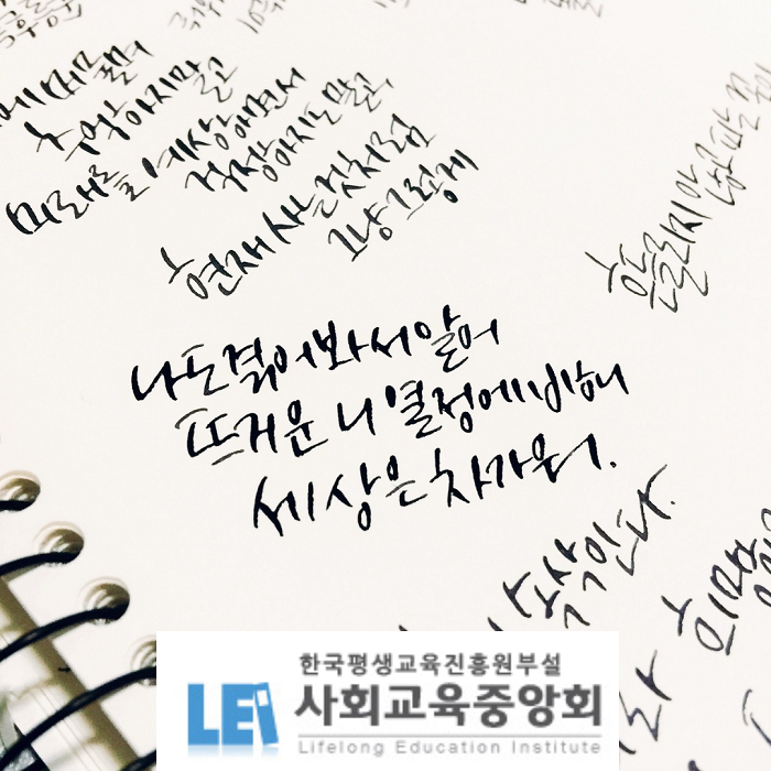 사회교육중앙회에서 캘리그라피지도사와 같은 지도 과정으로 수강을 해볼 수가 있으며, 성인이라면 누구나 쉽게 접근할 수 있고. 연계과정으로는 노인놀이지도사, 노후생활전문가, 노인두뇌훈련지도사, 노인심리상담사 등 배우면서 자격증 취득을 해볼 수가 있다.