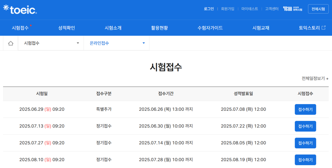 현재 6월 29일, 7월 13일과 27일, 8월 10일 시험에 대한 온라인 접수가 진행되고 있다.