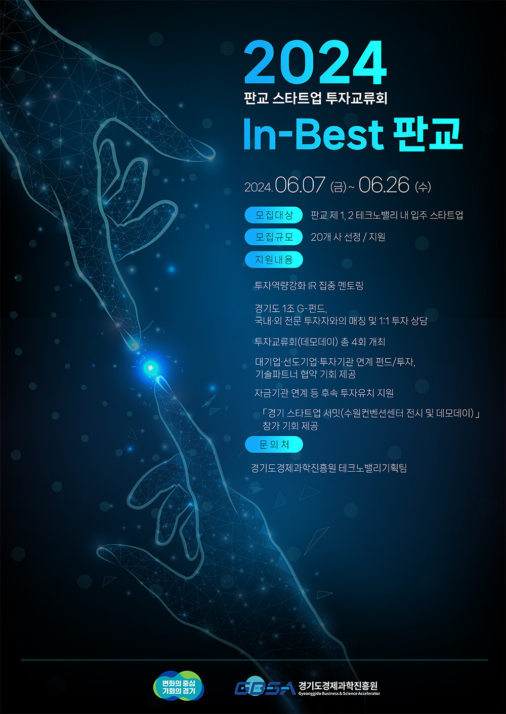 경기도와 경기도경제과학진흥원(이하 경과원)은 판교테크노밸리 내 스타트업의 투자유치 기회를 제공하기 위해 2024년 판교 스타트업 투자교류회 'In-Best 판교'의 참여기업을 26일까지 모집한다.