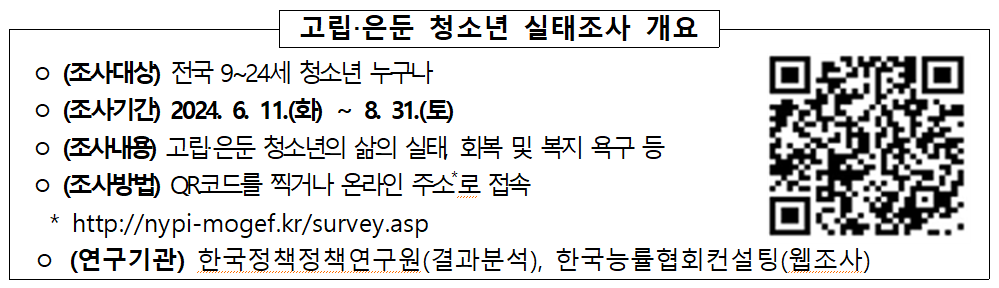 한편, 여성가족부는 고립·은둔 청소년의 생활 양상과 정책 욕구를 파악하기 위해 오는 31일까지 실태조사를 진행 중이며, 9~24세 청소년 누구나 참여할 수 있다.