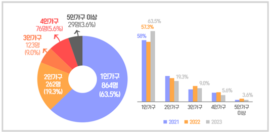 가구 유형은 1인 가구가 63.5%로 가장 많았고, 2인 가구(19.3%), 3인 가구(9.0%) 순으로, 가족 도움 없이 혼자서 부채를 고민하는 1인 가구가 과반을 넘어선 것으로 확인됐다.