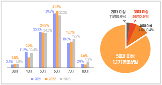 접수된 파산면책 신청 사례를 분석해보니, 신청자의 86.0%가 50대 이상인 것으로 나타나 경제 활동이 축소되는 고령자일수록 상환능력이 부족해 개인파산 신청이 늘어나는 것으로 확인됐다. 이 중 60대가 37.3%로 가장 높은 비율을 차지했으며, 80대 이상도 4.3%에 달해 전년 대비 2.6%p 증가했다.