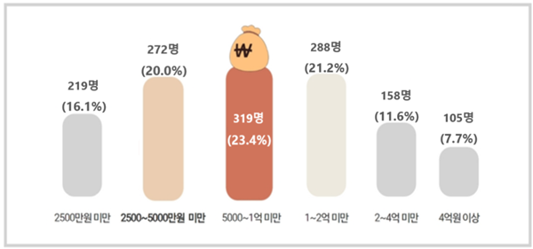 채무액은 59.5%가 1억 원 미만이었고, 평균 구간인 '5,000만 원 이상~1억 원 미만'이 23.4%를 차지했다.