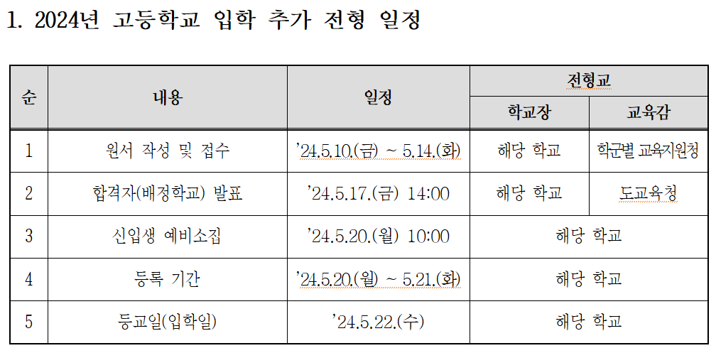 원서접수 5월 10~14일까지, 합격자 발표 5월 17일, 입학일 5월 22일