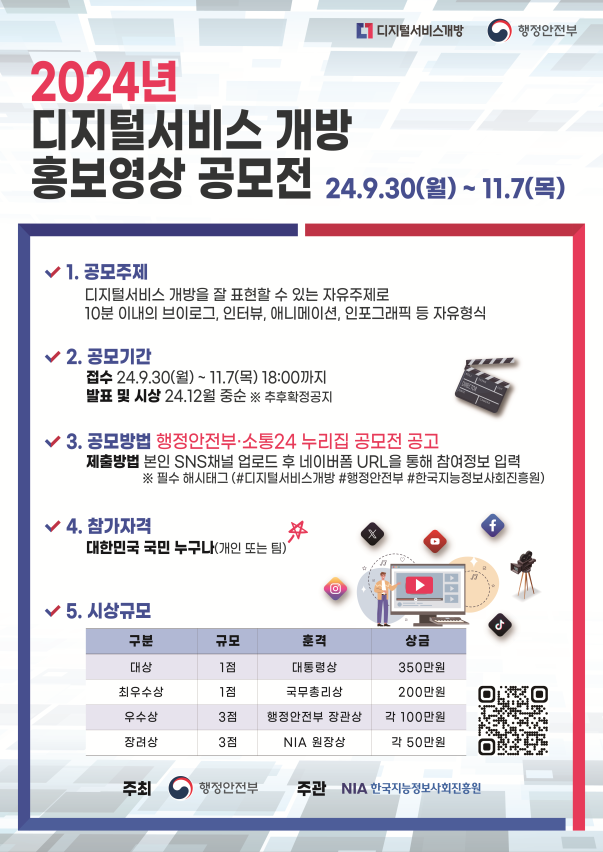 이번 공모전은 디지털서비스 개방 정책과 그 혜택을 국민에게 널리 알리고자 마련됐다. 공모전 참가자들은 디지털서비스 개방을 잘 표현할 수 있는 아이디어나 사례를 10분 이내 영상으로 제작하면 된다. 접수는 9월 30일부터 11월 7일까지 온라인으로 진행되며, 공모전 상세 내용은 ‘행정안전부 누리집’과 ‘소통24 누리집’에서 확인할 수 있다.