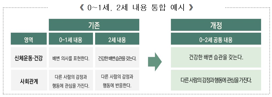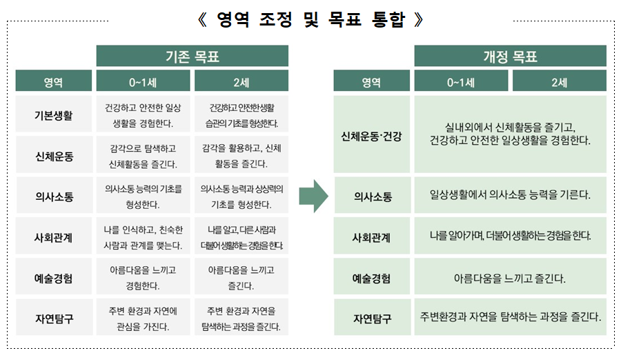 개정된 보육과정은 기존의 0~1세, 2세, 3~5세(누리과정)로 나뉘던 체계를 유지하면서도, 누리과정과의 연계를 강화했다. 기존 ‘기본생활’과 ‘신체운동’ 영역을 통합해 ‘신체운동·건강’ 영역으로 조정하면서, 6개 영역을 누리과정과 동일하게 5개 영역으로 재편했다. 또한, 0~1세와 2세로 나뉘어 있던 영역별 목표를 통합해 0~2세 보육과정으로 일원화했다.