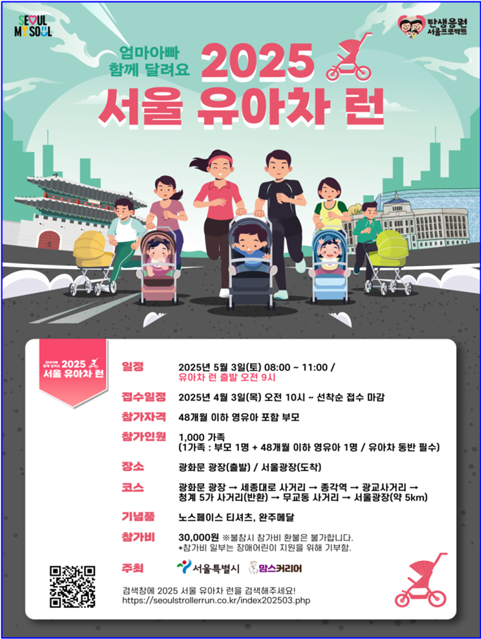 오는 5월 3일(토) 오전 9시, ‘2025 서울 유아차 런(Run)’이 광화문광장을 출발해 청계천을 거쳐 서울시청 광장까지 이어지는 3.6km 구간에서 펼쳐진다. 이번 행사는 육아로 인해 외부 활동이 쉽지 않은 영유아 가정에 특별한 하루를 선물하고자 기획됐다.