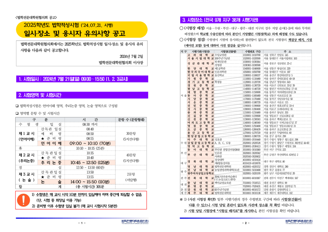 한편, 올해 법학적성시험은 7월 21일(일), 전국 9개 지구 38개 시험장에서 시행되며, 성적은 8월 20일(화)에 발표한다.
