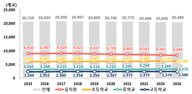 전국 유·초·중등학교 수는 20,480개교로 전년 대비 125개교 감소한 것으로 조사됐다. 유치원은 8,294개원으로 147개원이 줄어들었으나, 초등학교는 6,183개교로 8개교 증가, 중학교는 3,272개교로 7개교 증가, 고등학교는 2,380개교로 1개교 증가했다.