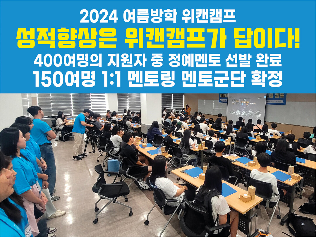 2024 여름방학 위캔캠프는 93~99기를 모집했으며, 98기를 제외한 나머지 기수는 자녀의 성적 향상을 원하는 학부모와 입시를 준비하는 학생들의 뜨거운 성원 속에 이미 모집이 완료되었다. 98기 역시 모집 마감이 임박해 신청을 원한다면 서둘러야 한다.