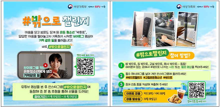 영상은 여성가족부 유튜브 채널에서 시청할 수 있으며, 인스타그램에서는 ‘밖으로 참여 잇기’ 챌린지가 9월 12일부터 10월 13일까지 진행된다.