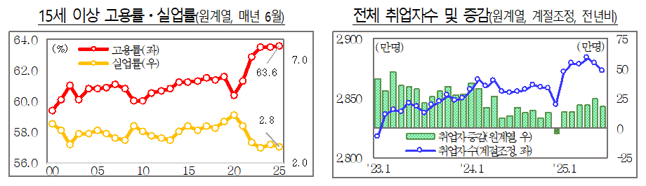 정부가 7월 16일 발표한 고용동향에 따르면 6월 15세 이상 고용률은 63.6%로 전년 동월 대비 0.1%포인트 올랐다. 15~64세 고용률도 70.3%로 0.4%포인트 상승해 역대 최고치를 기록했다. 경제활동참가율은 65.4%로, 실업률은 2.8%로 각각 소폭 개선됐다.