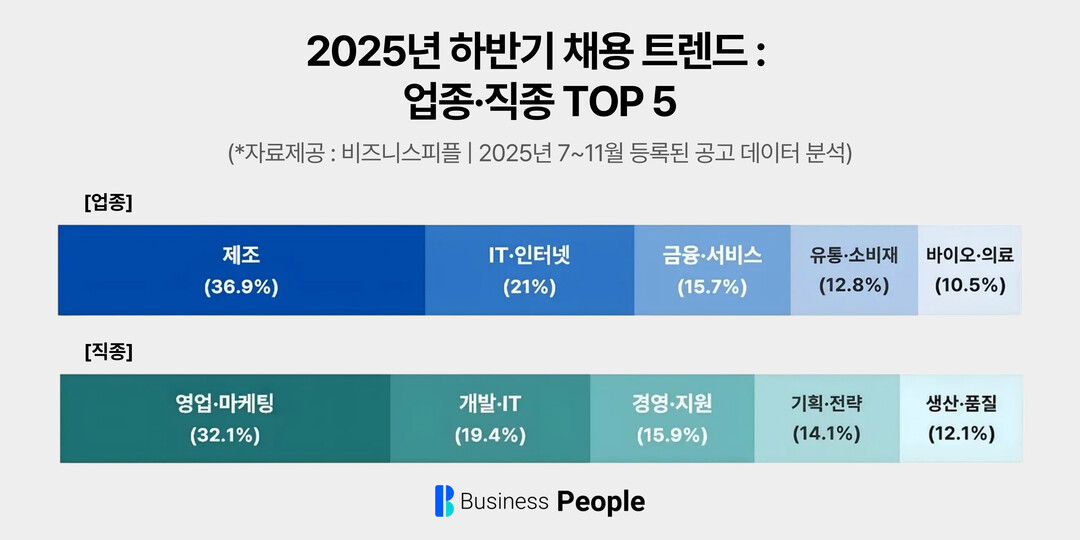 핵심인재 채용 플랫폼 비즈니스피플은 22일 올해 7월부터 11월까지 자사 플랫폼에 등록된 채용 공고를 분석한 결과, 하반기 채용이 단순 인력 보강보다는 실질적인 성과 창출이 가능한 직무와 인재에 집중됐다고 밝혔다.