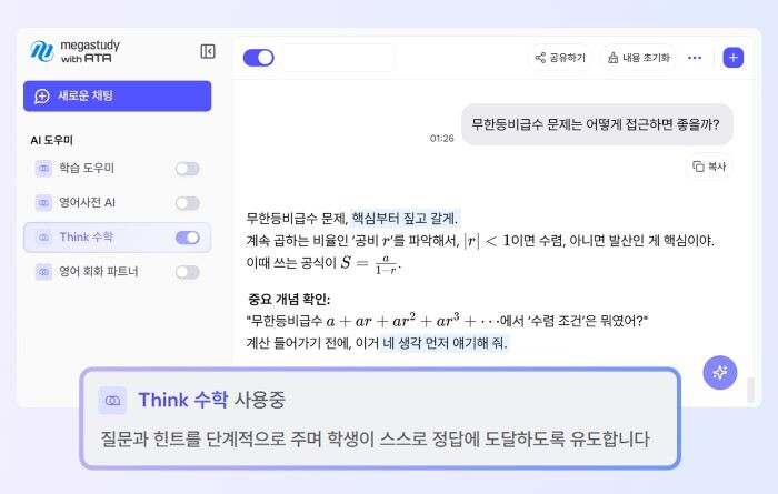 또한 ‘영어사전 AI’, ‘Think 수학’ 등 과목별 특화 프롬프트를 활성화하면 학습 맥락에 최적화된 답변을 받을 수 있다. 불필요한 탐색 시간을 줄이고 학습 효율을 극대화할 수 있다는 점이 강점이다.