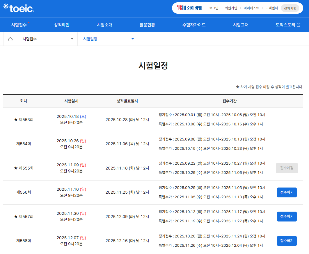 ▲YBM 어학시험 공식 사이트 토익 일정 캡쳐