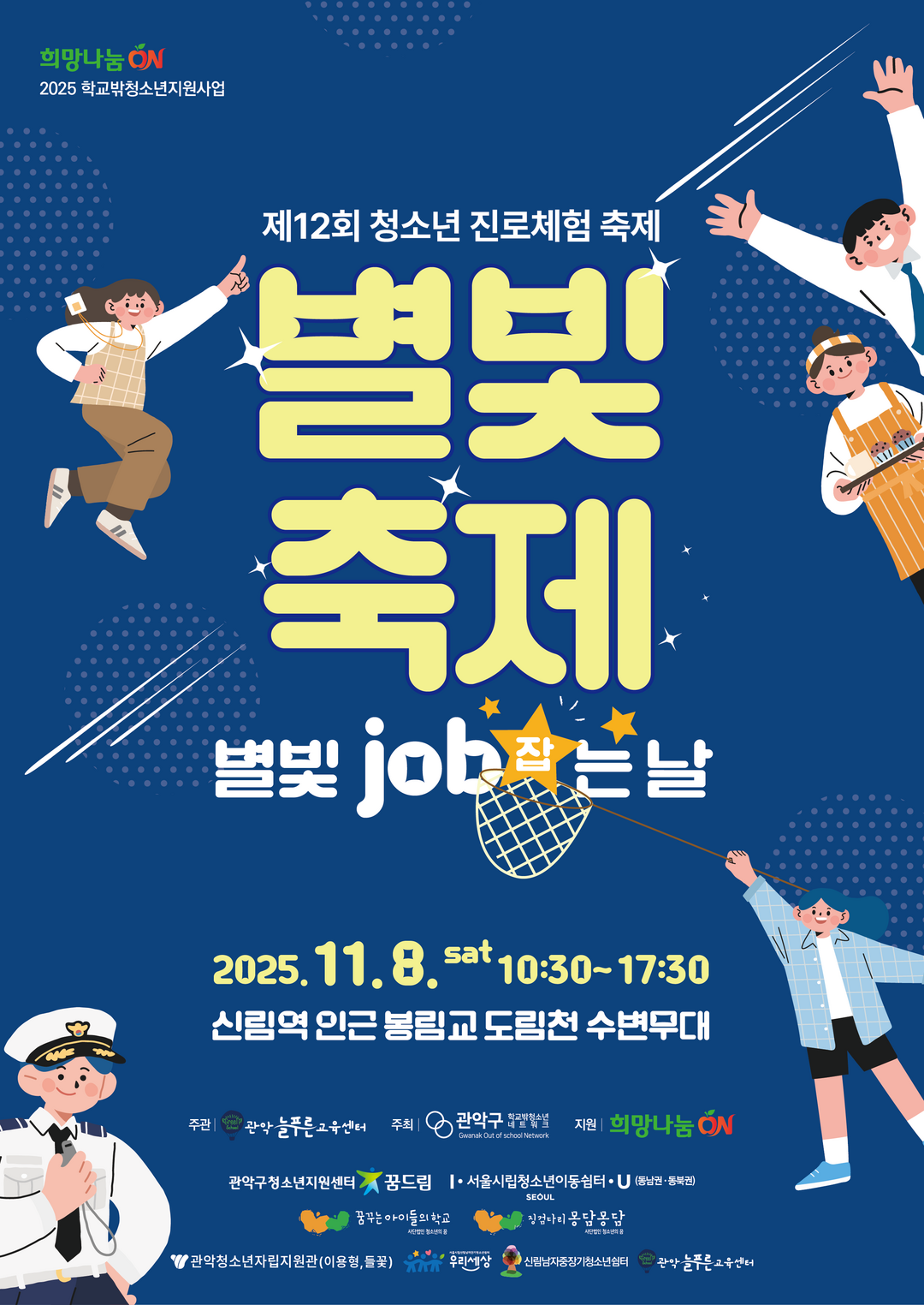 [피앤피뉴스=마성배 기자] 서울시 관악구 학교밖청소년네트워크(이하 관학넷)는 오는 11월 8일(토) 오전 10시 30분부터 오후 5시 30분까지 관악구 도림천 수변무대 일대에서 제12회 청소년 진로체험 축제 ‘별빛 축제 – 별빛 job(잡)는날’을 개최한다고 밝혔다.