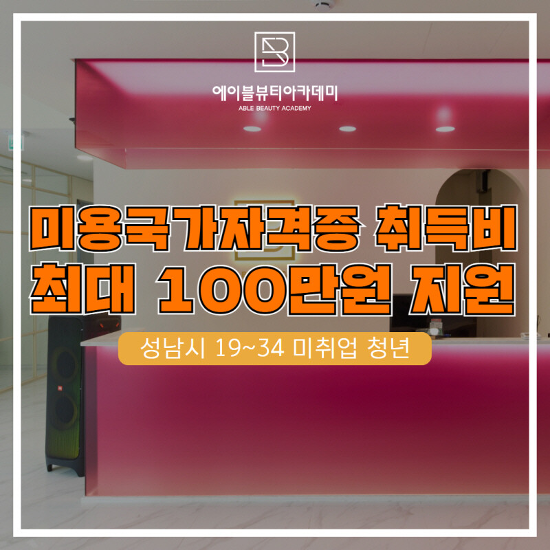성남 분당 미용학원 에이블뷰티아카데미가 성남시에 주민등록을 둔 19~34세 미취업 청년을 대상으로 국가자격증 비용 최대 100만원의 지원금을 지급한다고 밝혔다.