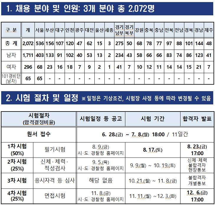 필기시험 합격자를 8월 23일(금) 오후 5시에 발표하고, (2차 시험)신체·체력·적성검사를 9월 9일부터 10월 19일까지 지방청별로 진행한다.