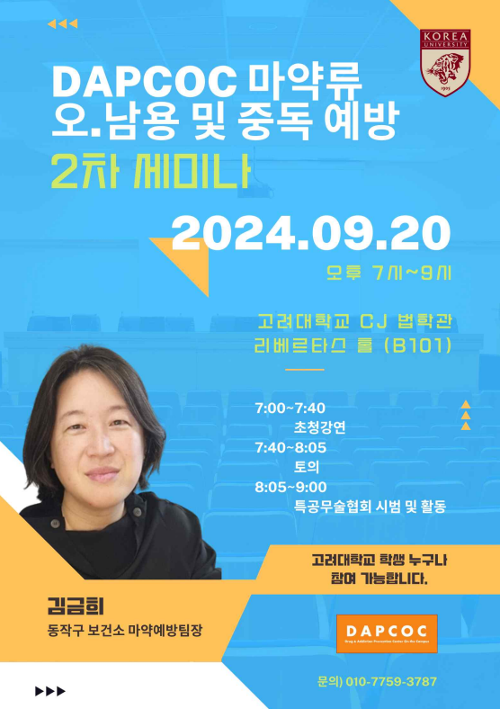 이번 세미나는 고려대답콕이 주최하는 두 번째 마약류 중독예방 행사로, 강연 후 대학생들이 참여하는 자유토론과 함께 특공무술 체험도 예정되어 있다.