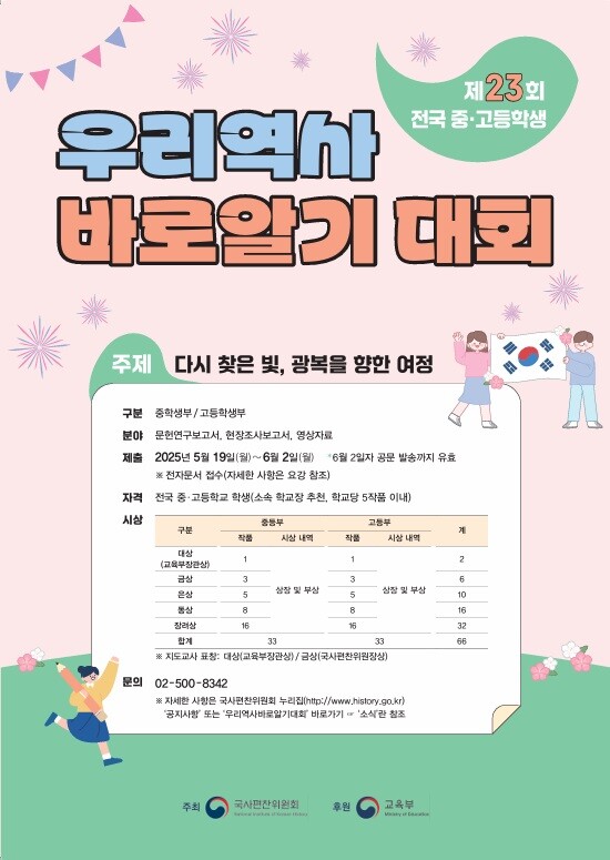 국사편찬위원회(위원장 허동현)는 2025년 ‘제23회 전국 중·고등학생 우리역사바로알기대회’를 개최하고, 전국 학생들의 참가를 모집한다고 18일 밝혔다.