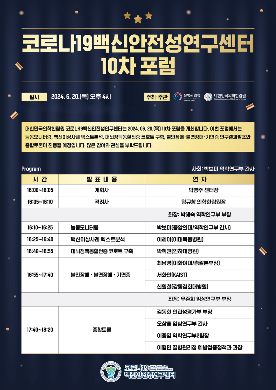코로나19백신 접종 후 이상사례 인과성 평가를 위해 설립된 대한민국의학한림원(원장 왕규창)의 ‘코로나19백신안전성연구센터(센터장 박병주)는 10차 포럼을 6월 20일(목) 오후 4시에 진행했다.
