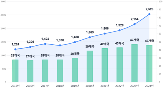 교육부는 1999년 미국 현지 학교에 한국어반을 처음 지원한 이후, 교원 파견·운영비 지원·현지 교원 양성과정을 운영하며 해외 한국어 보급을 확대해왔다. 그 결과 최근 10년간 해외 한국어교육 규모는 두 배 이상 성장, 2024년 기준 46개국 2,526개 학교에서 약 22만 명이 한국어를 배우고 있다.