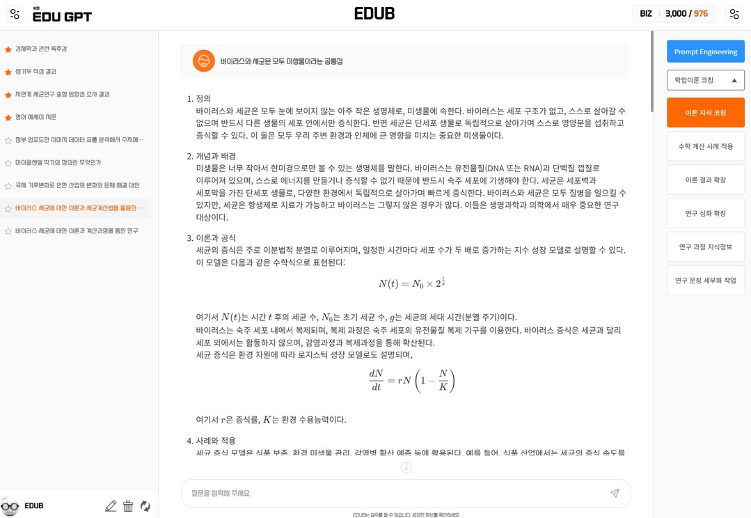 에듀비는 일반적인 인공지능 프로그램과 달리 중·고등학생들에게 특화된 맞춤형 학습 지원을 목표로 설계된 교육 전문 프로그램이다. 특히, 학생들이 가장 큰 어려움을 느끼는 '프롬프트 작성' 문제를 혁신적인 방식으로 해결했다. 기존의 인공지능 프로그램이 복잡하고 어려운 프롬프트 입력으로 사용자들을 혼란스럽게 했다면, 에듀비는 간단한 문장 하나만 입력해도 프롬프트를 자동으로 완벽히 형성해 준다. 이는 바로 프롬프트 엔지니어링 기술이 적용된 결과로, 학생들은 더 이상 긴 문장을 고민하거나 복잡한 형식을 갖추기 위해 시간을 허비하지 않아도 된다.
