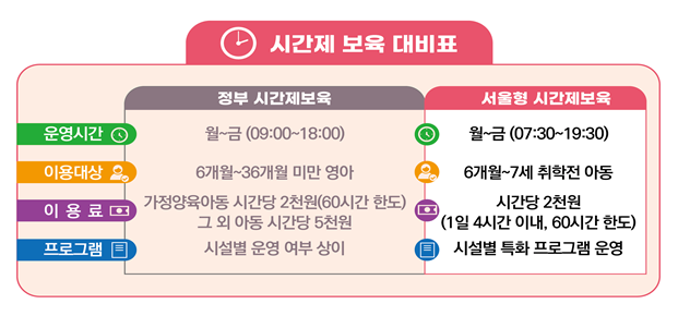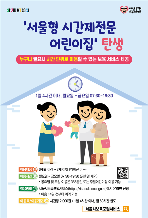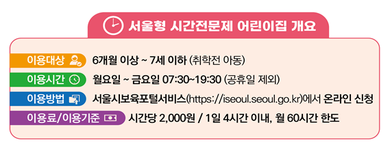 ‘서울형 시간제전문 어린이집’은 기존 어린이집의 유휴 공간을 활용해 주중 낮 시간대에 시간 단위로 1일 최대 4시간, 월 최대 60시간 한도로 이용 가능하며, 6개월에서 7세 이하 취학 전 모든 보육 연령대의 아이는 누구나 이용할 수 있다.