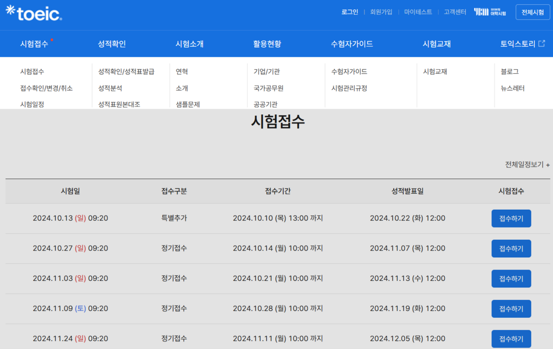 한편, 현재 10월 13일(일), 27일(일), 11월 3일(일), 9일(토), 24일(일) 등 토익 시험 접수가 진행 중이다.