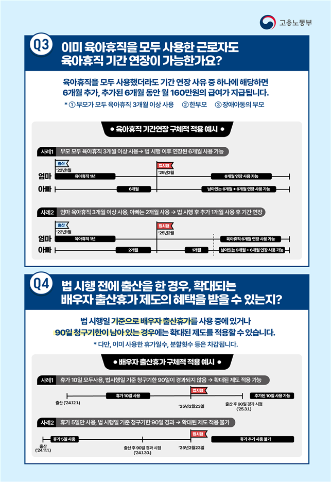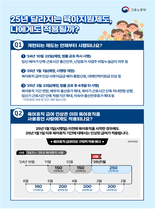 고용노동부에 따르면, 2025년 시행되는 육아지원 3법의 주요 내용으로는 ▲육아휴직 급여 월 최대 250만 원 인상 ▲육아휴직 기간 최대 1년 6개월 연장 ▲배우자 출산휴가 한 달 확대 ▲중소기업 대체인력지원금 120만 원 인상 등이 포함됐다.