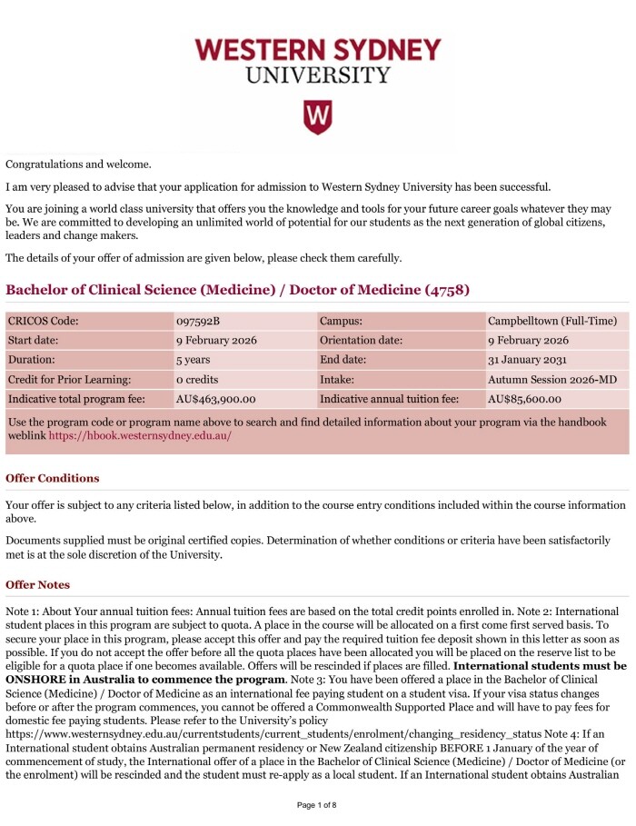WSU는 호주대학교 가운데서도 5년 통합 의대 과정(Bachelor of Clinical Science (Medicine)/Doctor of Medicine)을 운영하는 특별한 대학으로, 한국 학생들에게 '호주의대 진학 루트'로 잘 알려져 있다.