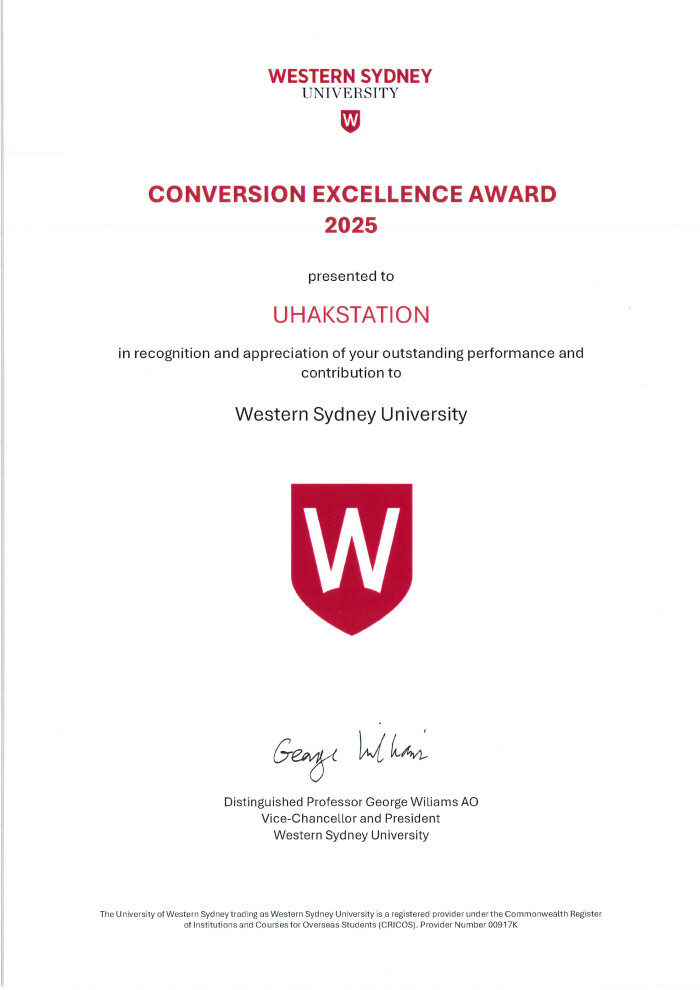 호주유학 전문 컨설팅 기관인 유학스테이션(Uhakstation)이 최근 호주 웨스턴시드니대학교(Western Sydney University, WSU)로부터 우수 에이전트상 (베스트 컨버젼)을 수상했다. WSU는 매년 글로벌 파트너를 평가해 우수 기관을 공식 선정하는데, 올해 한국 기관 중에서 해당 상을 받은 한국 에이전트는 유학스테이션이다.