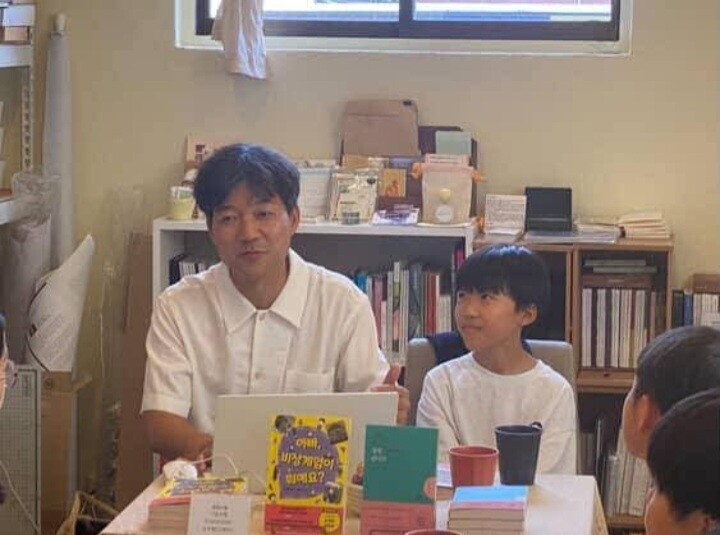 | ▲사진=지난 6월 14일, 을지로 방산시장에 위치한 독립서점 ‘그래서 책방’에서 열린 이경재 작가(왼쪽)의 두 번째 책 『아빠, 비상계엄이 뭐예요?』 북토크에 공동저자 자격으로 아들 정안 군(오른쪽)도 함께 자리했다. |