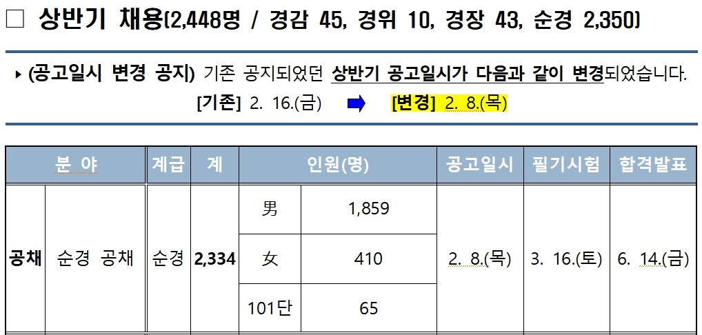 상반기 순경 공채 공고문은 당초 예정일보다 앞당겨 2월 8일(목)에 공지하고, 필기시험을 3월 16일(토) 실시한다. 이어 체력검사와 면접시험 등을 거쳐 6월 14일(금)에 최종합격자를 발표한다. 경채는 실기시험의 경우 2월 공고시 별도 공지할 예정이며, 필기시험을 제외한 공고 및 합격자 발표 일정은 공채 일정과 같다.
