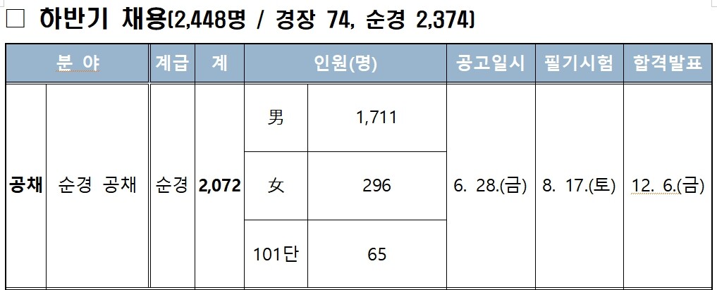 하반기 순경 공채는 △남자 1,711명, △여자 296명, △101단 65명 등 총 2,072명을 선발한다.