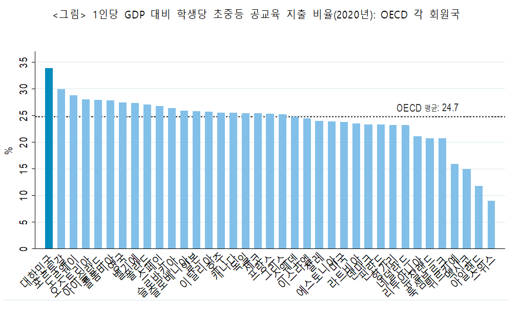 우리나라 1인당 GDP 대비 학생당 초중등교육 지출 비율(학생당 지출/1인당 GDP)은 OECD 회원국 중 1위로 나타났고, 2위 포르투갈 및 3위 노르웨이와 상당한 격차가 있었다. 반면, 고등교육에 대한 우리나라 재원투입은 OECD 평균에 크게 못 미치는 수준이었다.