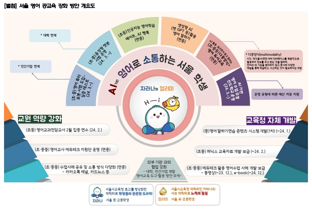 영어 공교육 강화 방안으로 2024년 3월부터 초·중 5개교에 ‘영어 튜터 로봇’을 지원하고, 같은 시기 초·중 3개교에 ‘음성형 챗봇’을 도입할 예정이다. 또한 인공지능 영어학습 메이트, AI 펭톡 운영 활성화하고, 생성형 AI 활용 영어 학습(말하기) 지원·‘읽으면서 듣고 말하는 다중양식’ 영어 독서교육도 활성화할 계획이다.