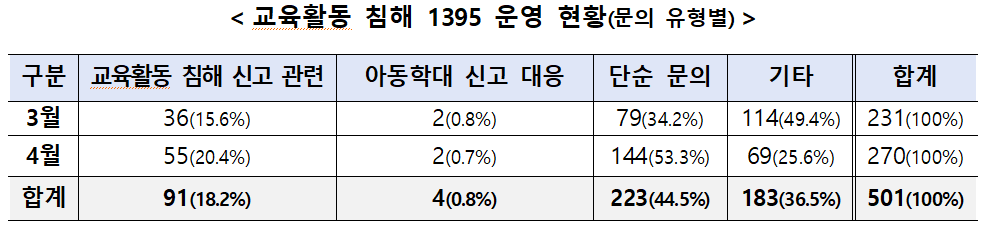 지난 3월 개통된 교권 침해 직통 번호 1395를 통해 교육활동 침해 신고, 상담, 법률 지원 등을 원스톱으로 제공받을 수 있다. 월평균 251건이 접수되고 있으며, 이용자 만족도가 매우 높은 것으로 나타났다.