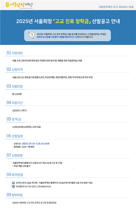 장학금에 대한 자세한 내용은 서울장학재단 누리집 또는 전화(02-725-2257)를 통해 확인할 수 있다.