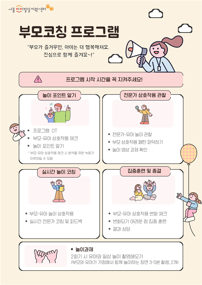 이번에 새롭게 도입된 1:1 부모코칭은 발달 검사와 심화평가를 거쳐 도움이 필요하다고 판단된 아이와 양육자를 대상으로 진행된다. 전문가가 아이의 발달 단계에 맞는 상호작용 방법, 대화법, 발달 촉진 전략을 4회에 걸쳐 코칭해주는 방식이다.