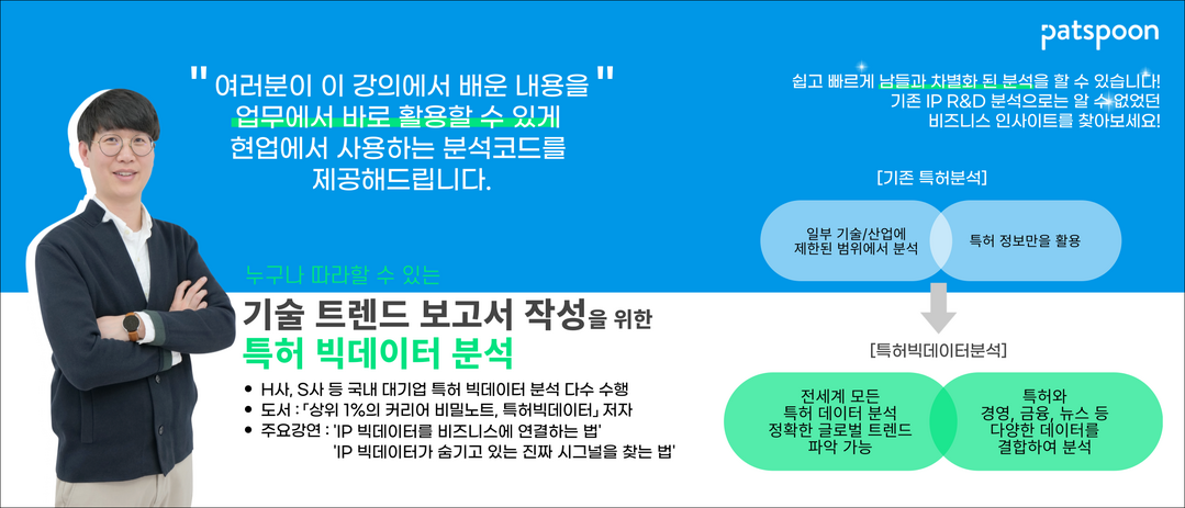 [피앤피뉴스=마성배 기자] 실무자들을 위한 IP교육 플랫폼 팻스푼(patspoon)이 ‘누구나 할 수 있는, 기술트렌드 보고서 작성을 위한 특허 빅데이터 분석 강의’를 새롭게 선보인다고 밝혔다.