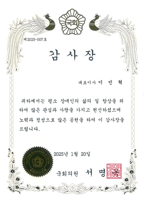 (주)네이처포뮬러 이민혁 대표는 장애인의 삶의 질 향상에 기여한 공로로 지난 1월 20일 투철한 봉사 정신과 헌신적인 노력으로 이러한 인정을 받아 감사장을 수상했다고 전해졌다.
