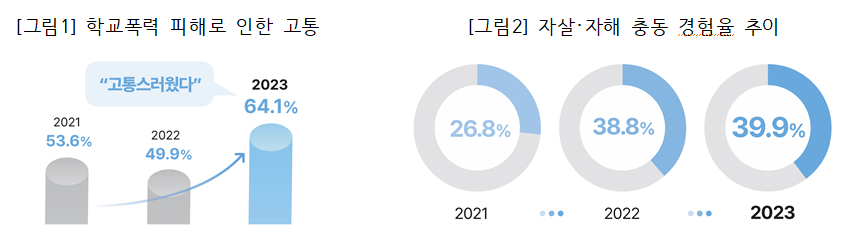 학생실태조사에 따르면, 학교폭력 피해로 인한 고통을 호소한 학생은 64.1%로 나타나, 2017년 이후 최고치를 기록했다.